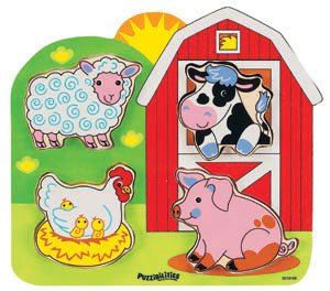 Level 1 Chunky Puzzles by Small World are the perfect first puzzles! The Farm Animals Friends puzzle has just 4 bright pieces - a bright woolly sheep, a happy cow, hen and her chicks, and a pretty pink pig - that are just the right size for small hands to grasp. Designed just for toddlers, the 5/8" thick wooden pieces have smooth edges and are easy for little hands to grasp, offering new motor skill challenges for developing preschoolers. Just 4 pieces per puzzle give any child a feeling of confidence, while contrasting colors teach visual discrimination. Cheerful, familiar pictures stimulate a tot's interest and encourage speech. Farm Animal Friends Chunky Puzzle is great for parent-child playtime.
