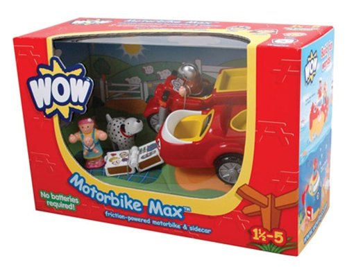My 2 1/2 year old son loves all his WOW toys, but Motorbike Max holds a special place in his heart. With Max, Mommy (with her baby in a sling - not certain of the really life safety of that!), a dog and a picnic basket, it is ready to go on any number of adventure. It's durable and the friction-powered motorbike really zooms on our hard floors!