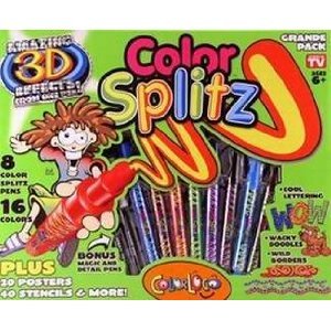 Two and one pens that color like a regular marker or split the color for 3D effects. Makes coloring a magical experience. Includes 20 posters to color, 8 Color Splitz pens, 1 magic pen, 1 black detail pen, 20 how to draw projects, 60 stencil designs, plus 4-page instruction book. Everything you need to make doodles, patterns, textures and coloring fun.