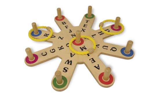 Make a game out of spelling words! Toss the rings onto pegs to win a letter and build a word. Individual child or teams can play. Sturdy wooden base spins, increasing difficulty level. Includes 2 hand-held score boards (reversible chalk and write-and-wipe) and 6 toss rings.